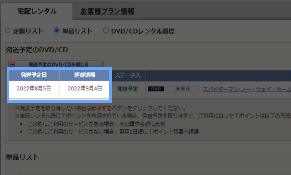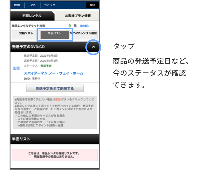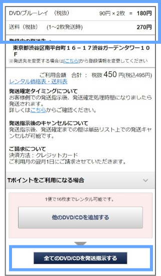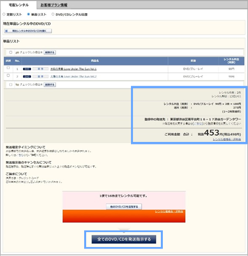 レンタルしたい作品を単品リストに登録して、発送指示をすると商品が発送されます。